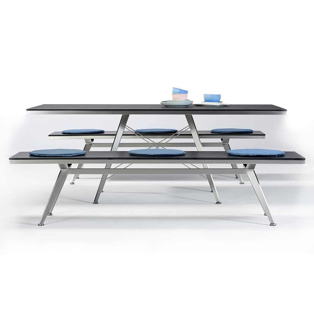 Das Gestell der Gartenbank besteht aus hochwertigem und pflegeleichtem Edelstahl. Neben seiner ansprechenden Optik bietet dieses Material auch eine hohe Stabilität. Das Gestell besticht mit seinen attraktiven Kufen.