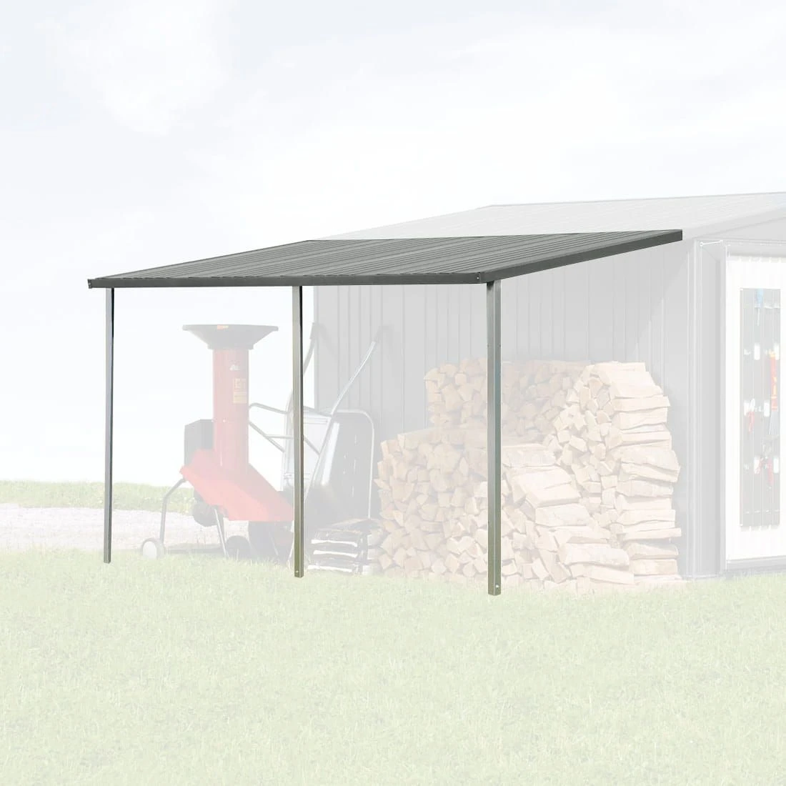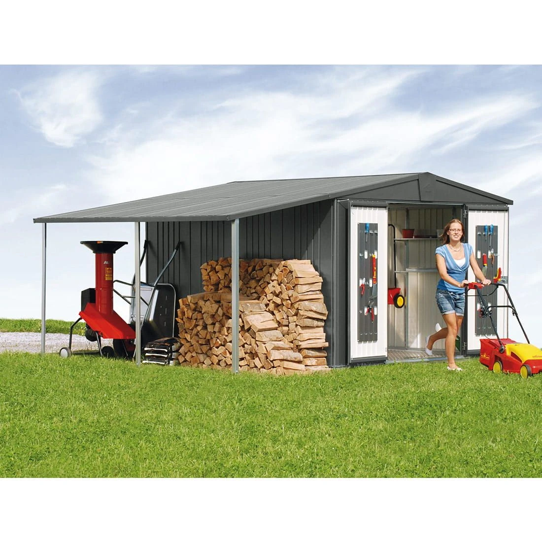 Das Biohort Europa Seitendach in Dunkelgrau-Metallic für die Gerätehäuser 6 und 7 kann wahlweise links, rechts oder beidseitig (bitte 2 Seitendächer bestellen) angebaut werden. Der Bausatz enthält die Stützen, ein kurzes Regenfallrohr und das Befestigungsmaterial.