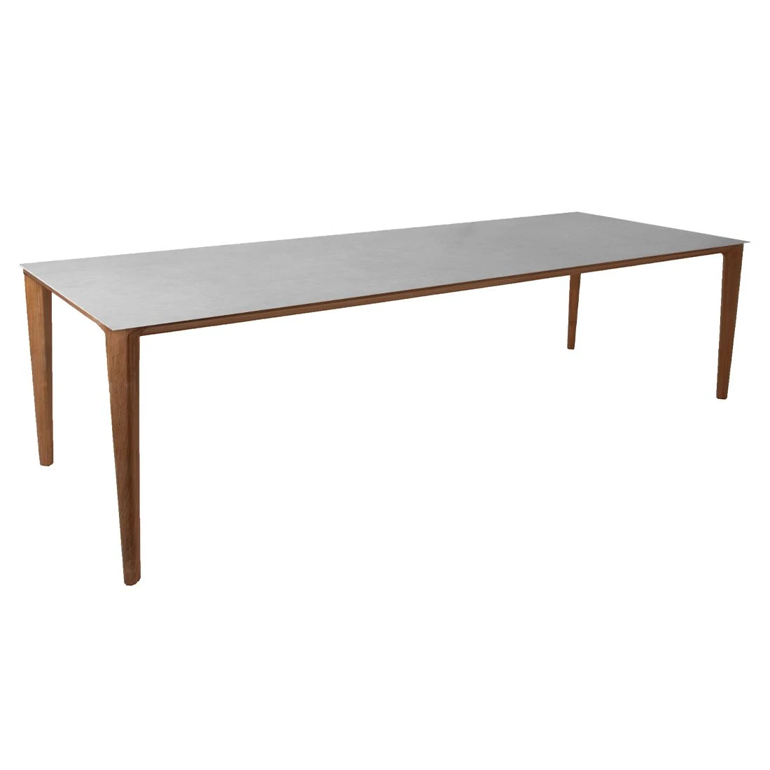 Das Gestell wird aus Teakholz gefertigt und bringt dadurch ein natürliches Flair auf Ihre Terrasse. Farblich ist das Gestell in Natur gehalten. Die Tischplatte ist aus edlem Keramik gefertigt. Im Gegensatz zu vielen anderen Tischplattenmaterialien sind Keramikplatten äußerst kälte- und hitzebeständig und zählen somit zu den robustesten Tischplatten auf dem Markt. Farblich ist die Tischplatte in einem schönen Concrete Grey gehalten. Klassisch aus vier Tischbeinen besteht das Gestell des Tisches. Das Design des Gartentisches ist klassisch rechteckig gehalten.