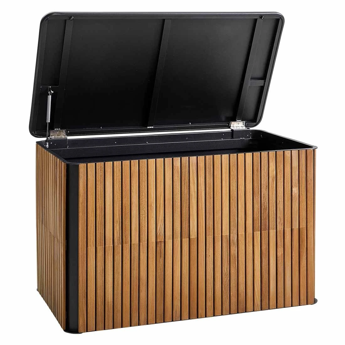 Der Korpus wird aus Teakholz gefertigt und bringt dadurch ein natürliches Flair auf Ihre Terrasse. Farblich ist die Gartenbox von Cane-Line in ansprechendem Natur gehalten. Ideal, um in verschiedene Gestaltungskonzepte integriert werden zu können.
