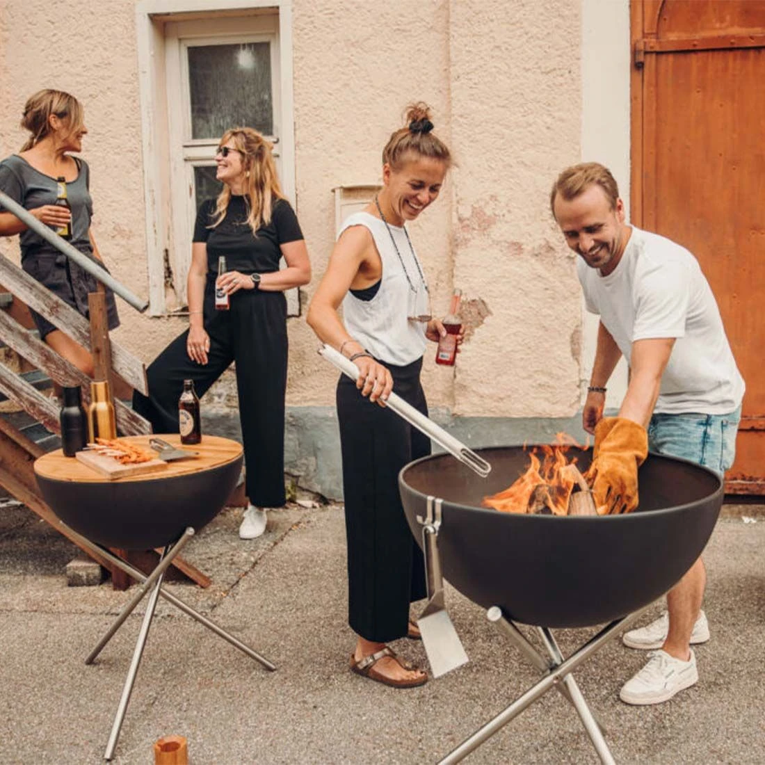 Der Clou: Die Feuerschale lässt sich auf dem Dreibein individuell platzieren. Ob ausdrucksstark nach oben geneigt oder klassisch elegant in waagrechter Position – richten Sie das Feuer ganz nach Ihrem Bedarf aus.