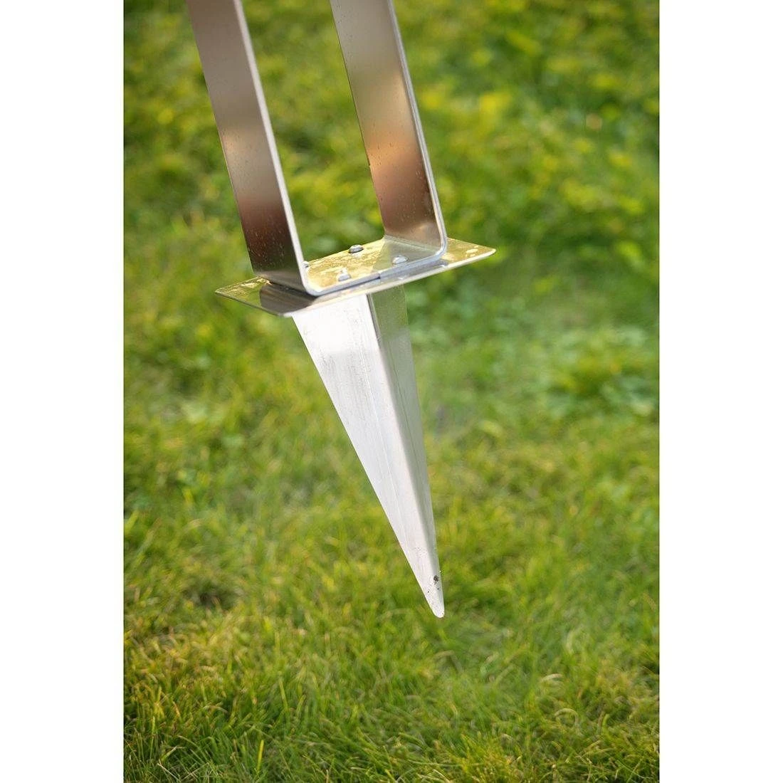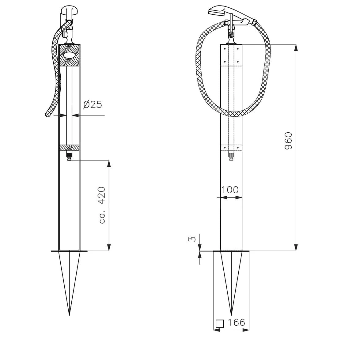 Altena Mini – Gartendusche aus witterungsbeständigem Holz und hochwertigem Edelstahl. Hier in der niederen Ausführung mit Hand- statt Kopfbrause. Sie ist einfach zu montieren; sie wird mit einem Erddorn im Rasen verankert und steht extrem stabil. Jetzt nur noch mit einem Gartenschlauch anschließen und schon kann das Vergnügen beginnen.