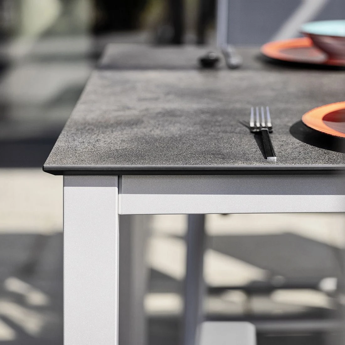 Die stabile und kratzfeste Tischplatte aus pflegeleichtem HPL-Kunststoffverbund ist im Besonderen für Gartenparties unter freiem Himmel und das Essen draußen außergewöhnlich gut geeignet. Farblich ist die Platte in Anthrazit gehalten. Die Form der Tischplatte ist kompakt quadratisch gehalten.