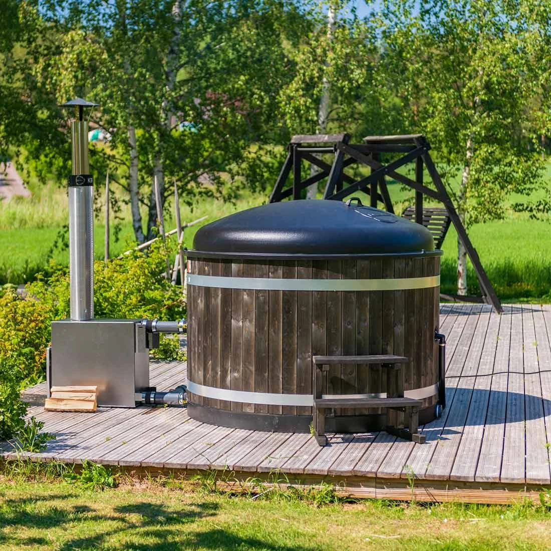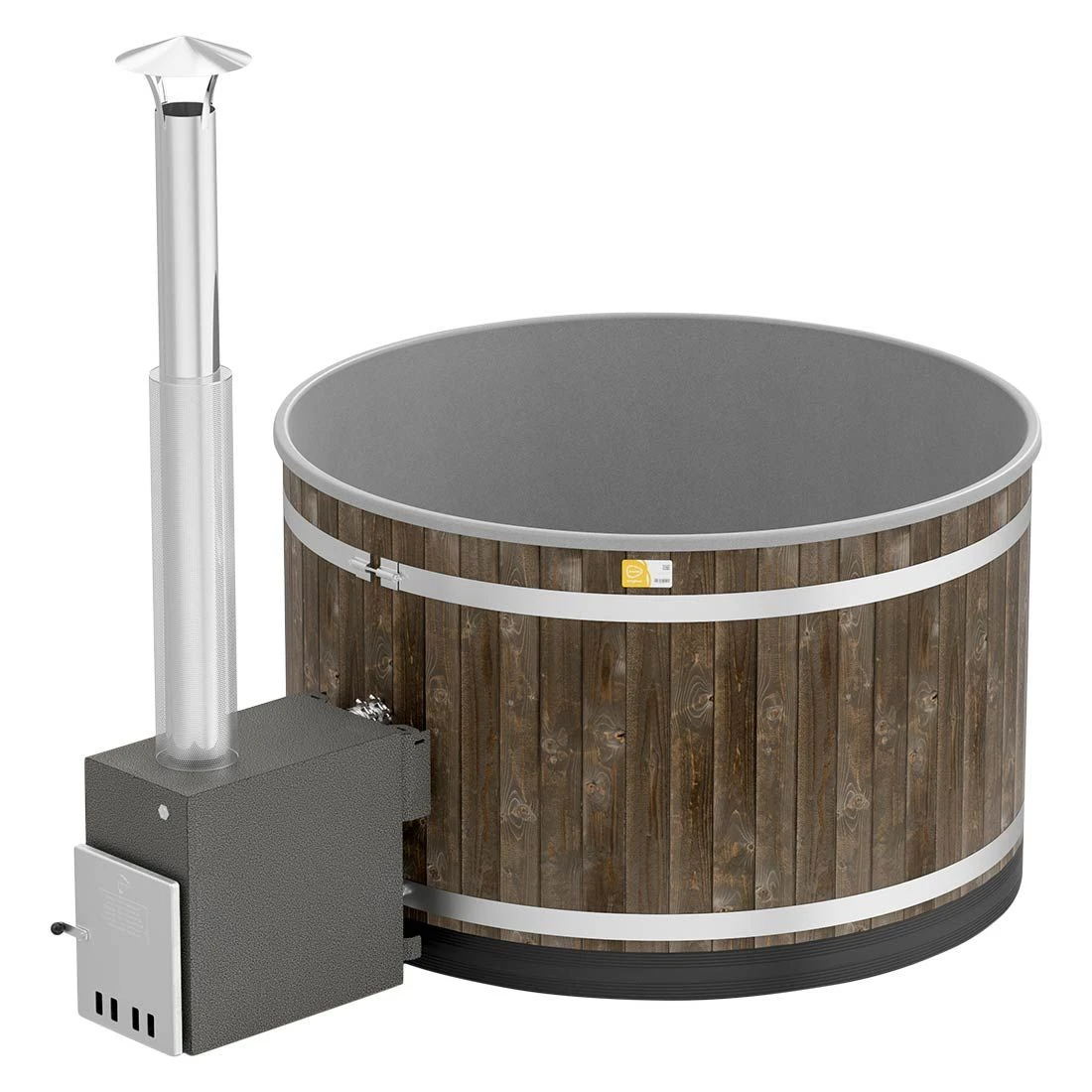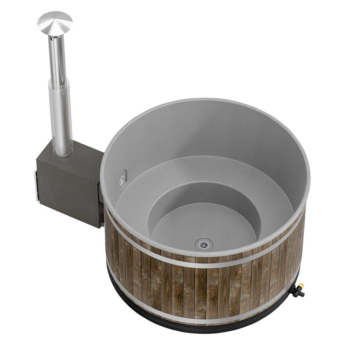 Als Außenofen kommt der grau gehaltene CULT-si zum Einsatz, der sich ideal zum Beheizen kleiner Badefässer eignet. Er wurde aus hochwertigem Meeresaluminium gefertigt, was eine äußerst gute Wärmeleitfähigkeit sicherstellt. Als Außenverkleidung dienen in einem schwarzen Kohlefarbton gebeizte Fichtenpaneele aus Finnland, deren schönes Erscheinungsbild lange erhalten bleibt. Die durchscheinende, hellgraue Innenwanne wird durch den leichten „Flöckchen-Effekt“ optisch zusätzlich aufgewertet. Die helle Farbe des Innenbeckens ist ebenso zeitlos wie trendy und fügt sich wunderbar in die Umgebung ein.