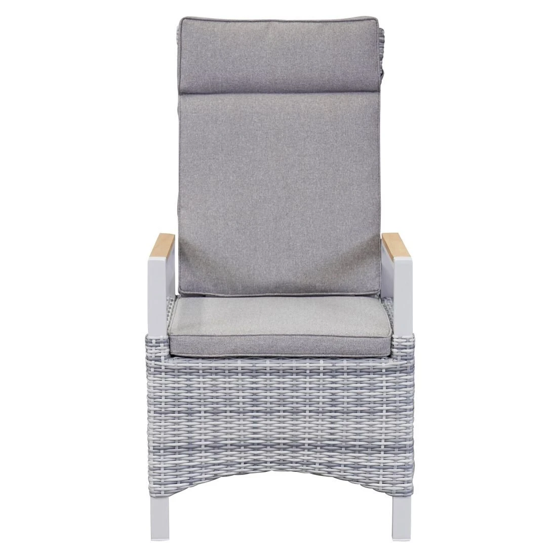 Das Gestell besteht aus pflegeleichtem und wetterfestem Aluminium in der Farbe Off White. Ein Material, das mit seiner Robustheit überzeugt. Die Sitzfläche, die mit hochwertigem Polyrattan umflochten ist, bringt ein exklusives Ambiente auf Ihre Terrasse. Dieses Material zeichnet sich durch eine hohe Wetterbeständigkeit aus. Der Bezug des Loungesessels ist aus Polyester gefertigt. Auch wenn der Bezugsstoff Wind und Wetter trotzen kann, empfehlen wir, abnehmbare Kissen bei länger andauernder Feuchtigkeit und im Winter drinnen zu lagern.