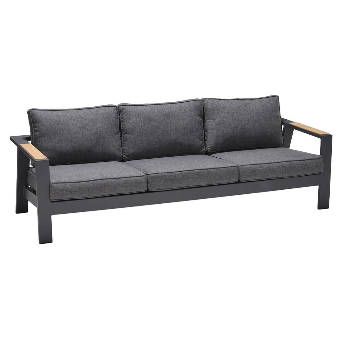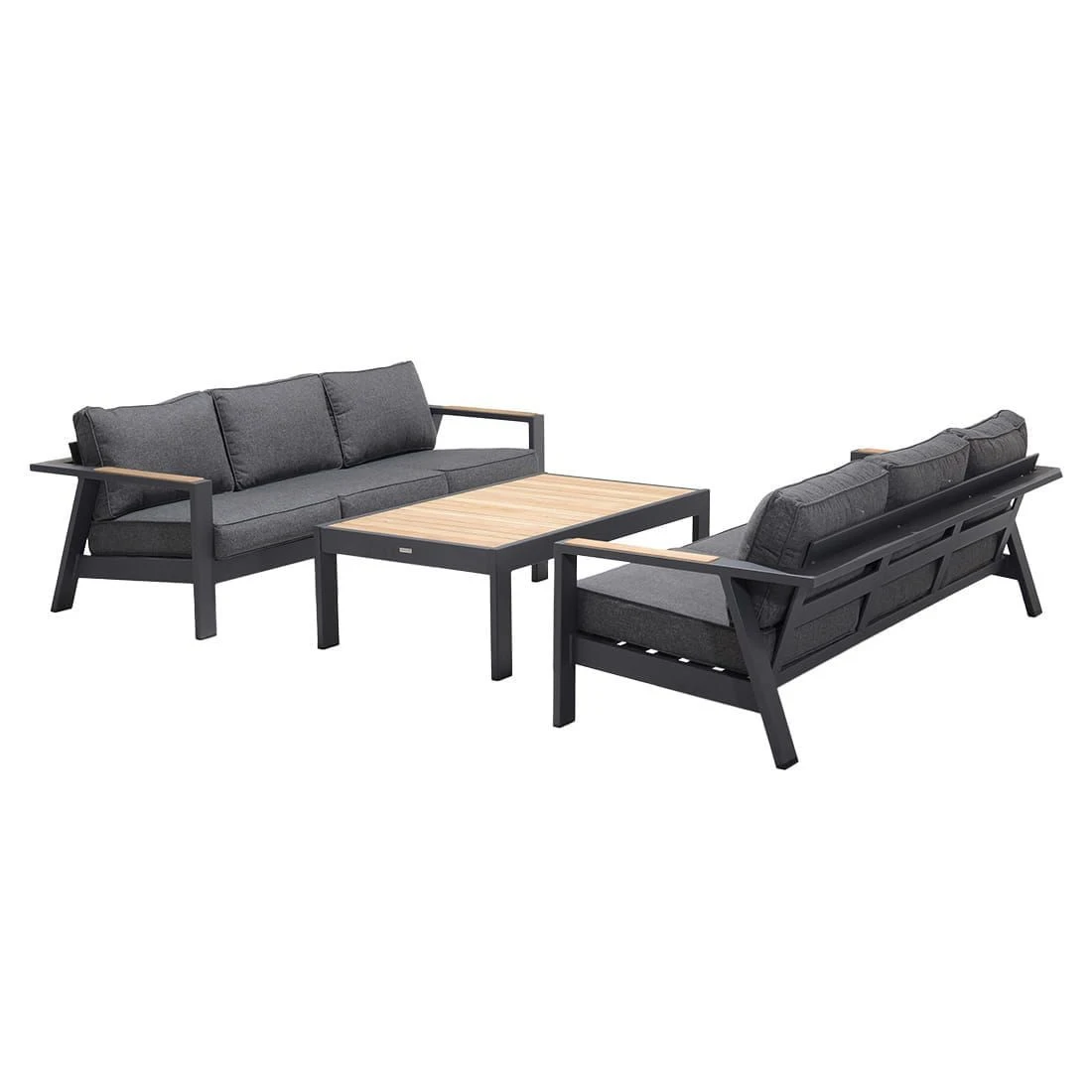 Damit das Loungeset optisch ansprechend ist, sind das Gestell und der Bezug im Farbton Dunkelgrau gehalten. Die Bezüge sind aus dem Marken-Outdoorstoff Olefin gefertigt. Das Material verbindet eine angenehme Stoffoberfläche mit hoher Witterungsbeständigkeit. Denn sowohl Sonne als auch Regen können dem robusten Outdoor-Stoff kaum etwas anhaben. Die Platte des Tisches ist aus wertigem Teakholz gefertigt. Durch den sehr hohen natürlichen Ölanteil ist sie bereits von Haus aus ausgezeichnet vor Witterungseinflüssen geschützt. Farblich überzeugt die Tischplatte in Teakholz.