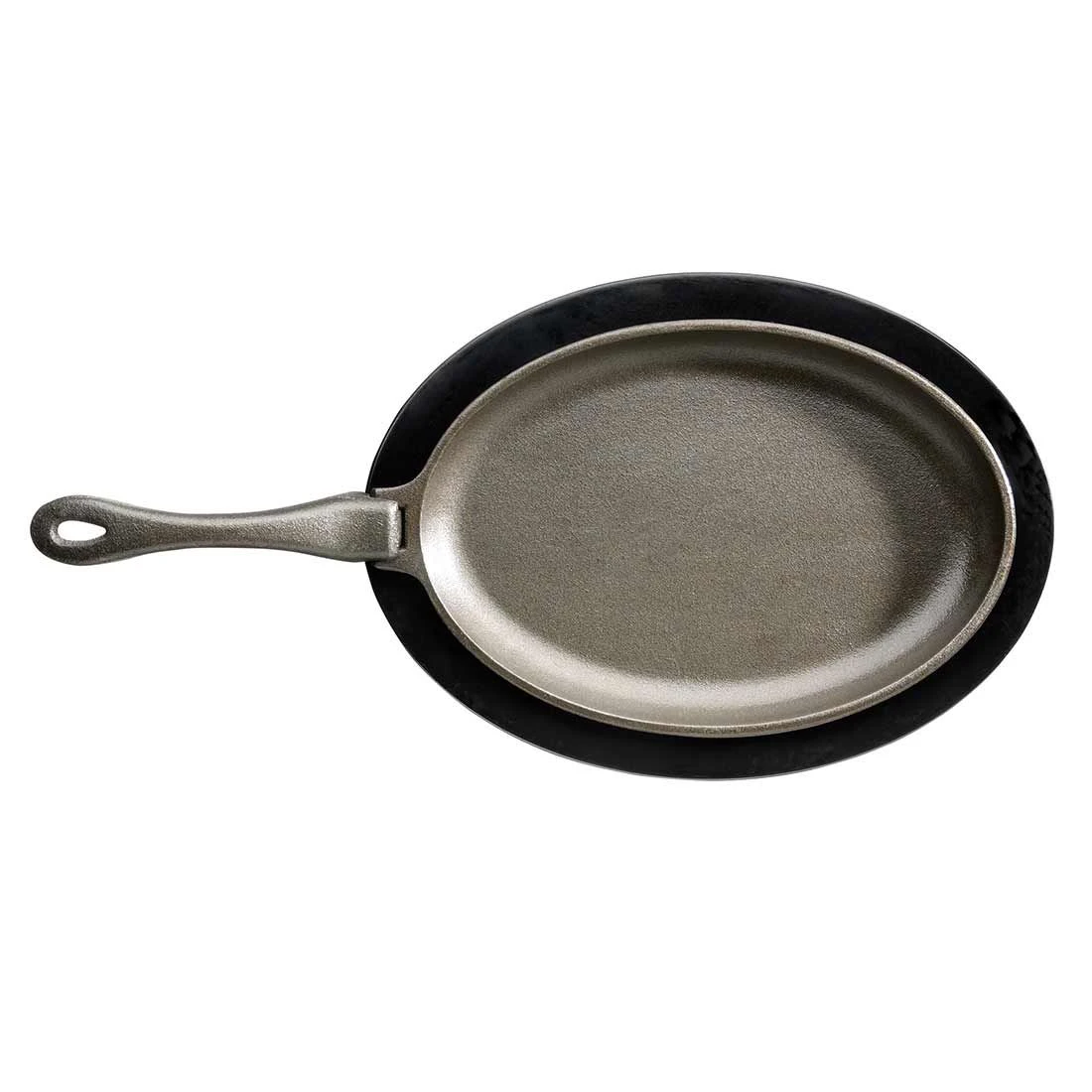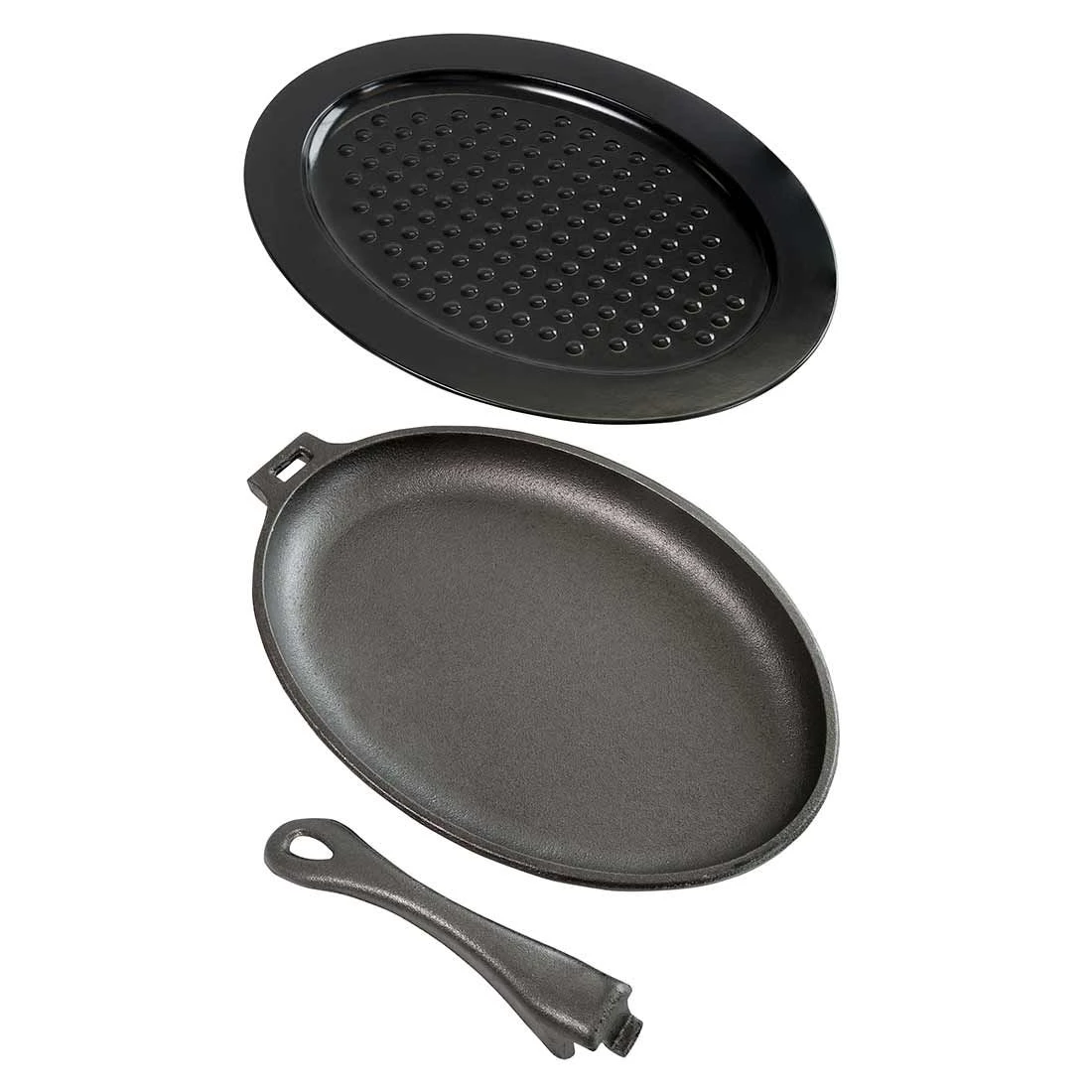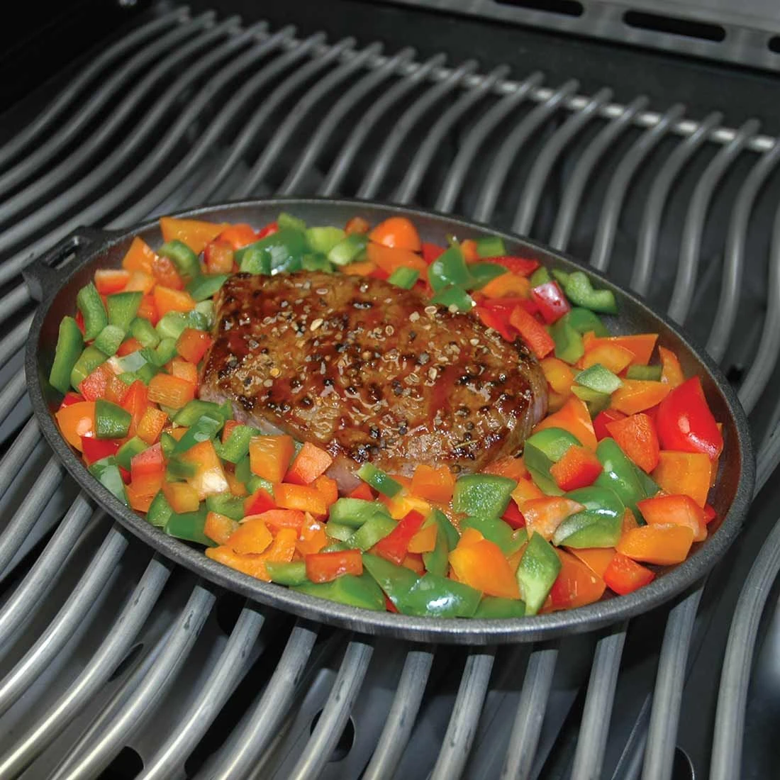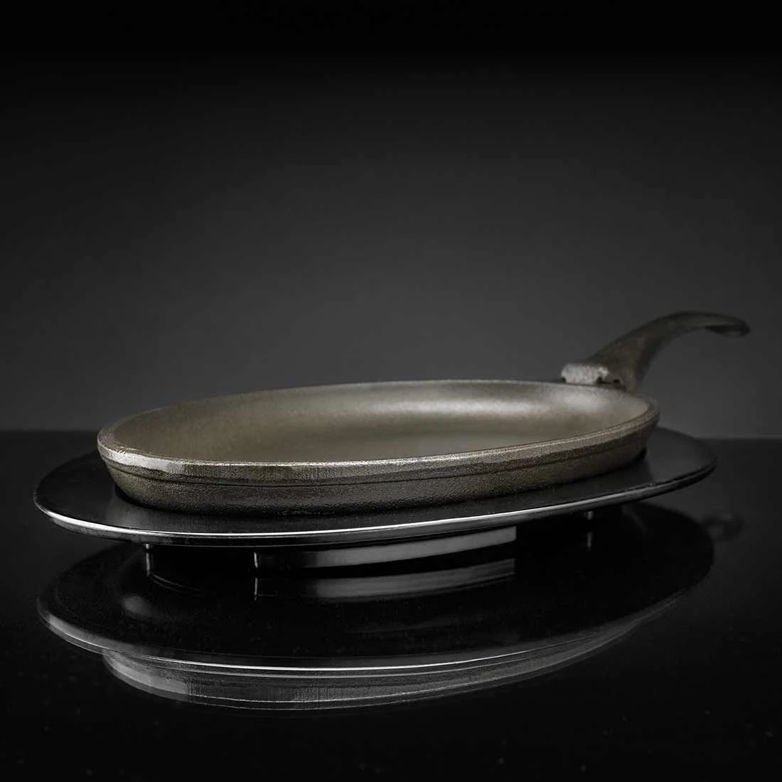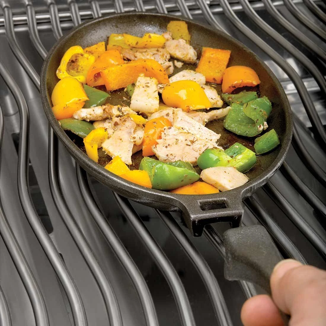 Robuste Napoleon® Gusseisen-Pfanne mit abnehmbarem Griff für die Zubereitung von Beilagen und Saucen. Inklusive schwarzem Untersetzer.