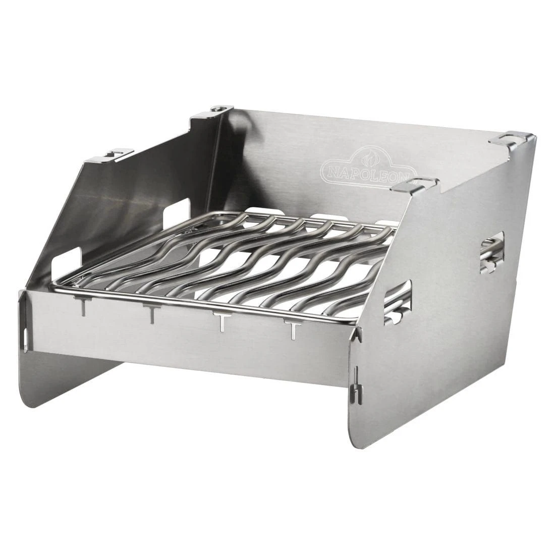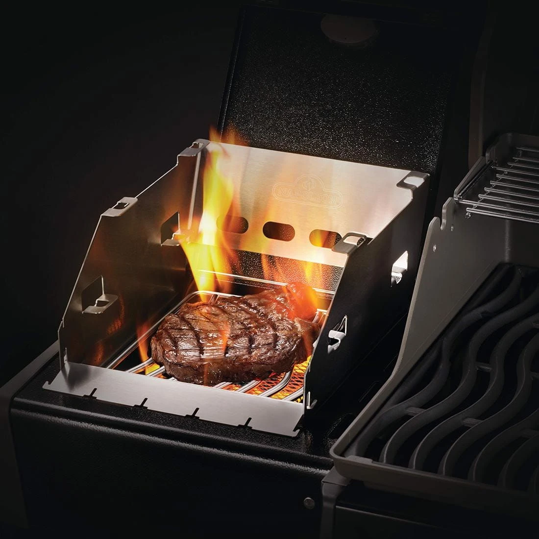 Multifunktionaler Napoleon® Windschutz. Dadurch brennt die SIZZLE ZONE™ auch bei stärkerem Wind stabil. Der Grillrost kann in drei weitere Positionen verstellt werden. Die vordere Blende ist klappbar, so dass der Zugang mit der Grillzange erleichtert wird. Zudem ist eine Spieß-Halterung integriert, die es ermöglicht über der SIZZLE ZONE™ Grillspieße ohne direkten Kontakt zum Rost zu grillen. Für Napoleon® RXT-Serie geeignet.