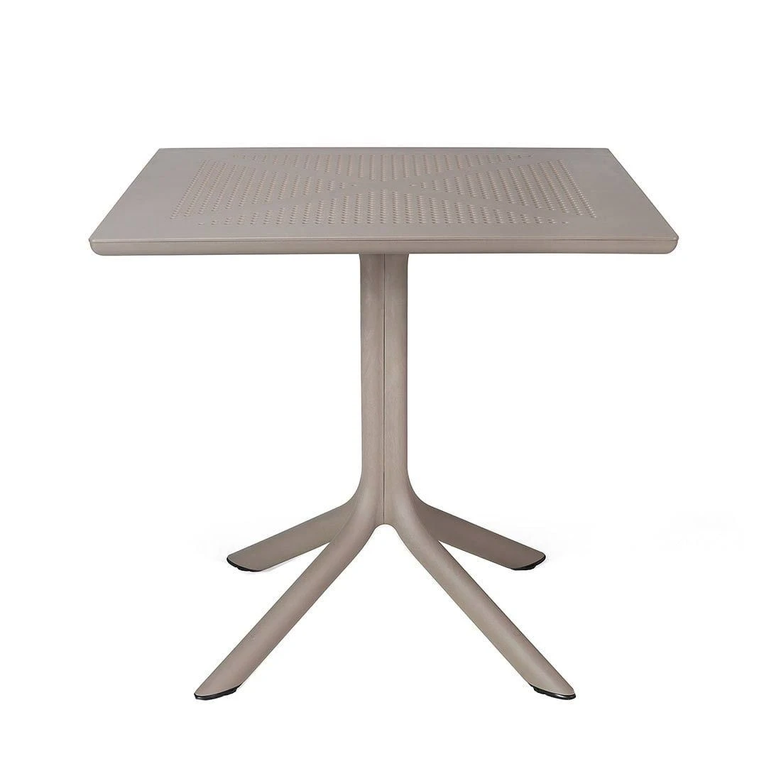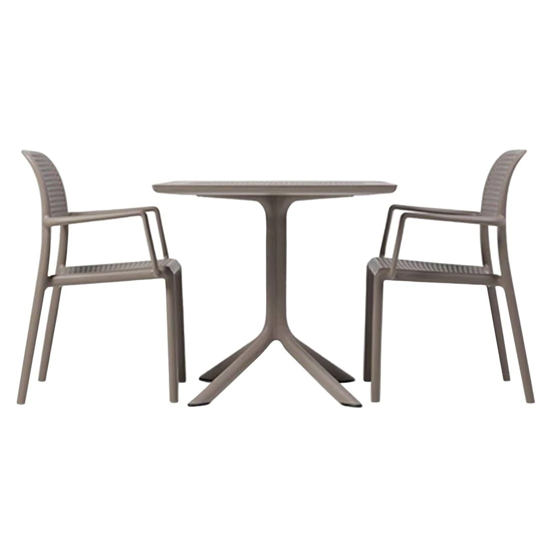 Das Gartenmöbel-Set begeistert damit, dass das Gestell, die Sitzfläche und die Tischplatte aus Kunststoff gefertigt sind. Dies erzeugt nicht nur ein elegantes, sondern auch ein einheitliches Gesamtbild. Für ein perfekt stimmiges Gesamtbild sorgt die einheitliche Farbgebung in stilvollem Taupe. Den finalen Schliff erhält das Gestell durch seine attraktive Säulenform. Diese ist nicht nur ein absoluter Blickfang, sondern ermöglicht auch rundherum viel Beinfreiheit. Der Tisch ist in seiner Form klassisch quadratisch gehalten.