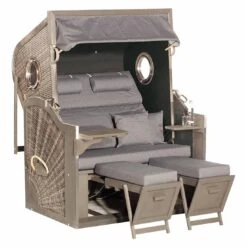 Die Bezüge des Strandkorbs bestehen aus Strukturpolyester-Gewebe. Das Material überzeugt mit einer angenehmen Haptik und einer hohen Witterungsbeständigkeit. Der Strandkorb selbst besteht aus Akazienholz sowie Kunststoffgeflecht. Beides harmoniert hervorragend miteinander. Das Grundgerüst des Strandkorbs ist in Grau gehalten. Darüber hinaus überzeugt der Strandkorb Cliff mit seinem Kunststoffgeflecht im Farbton Vintage Anthrazit.