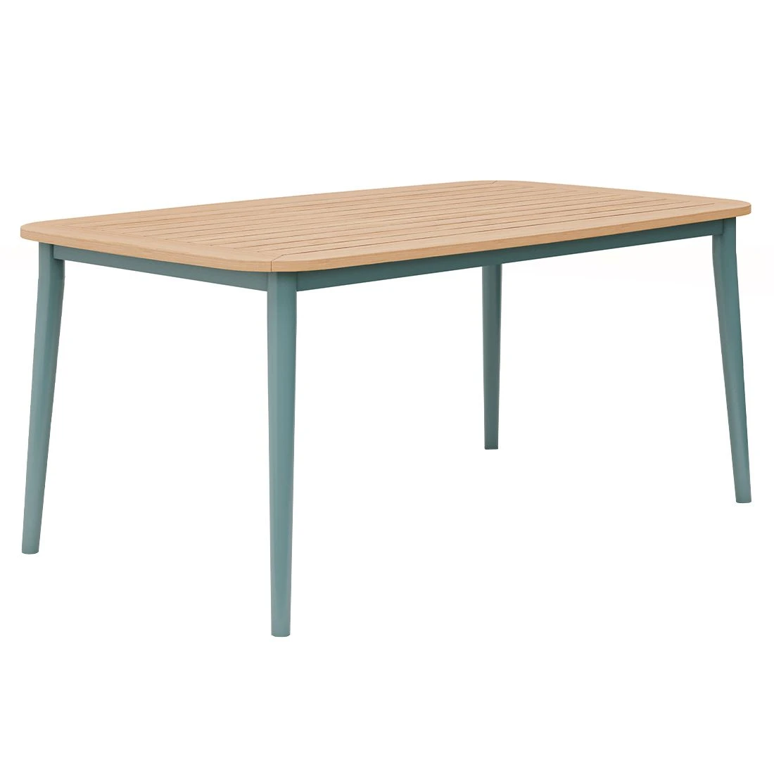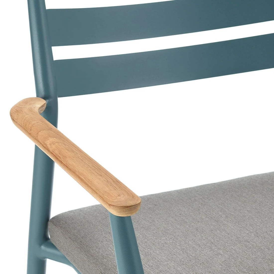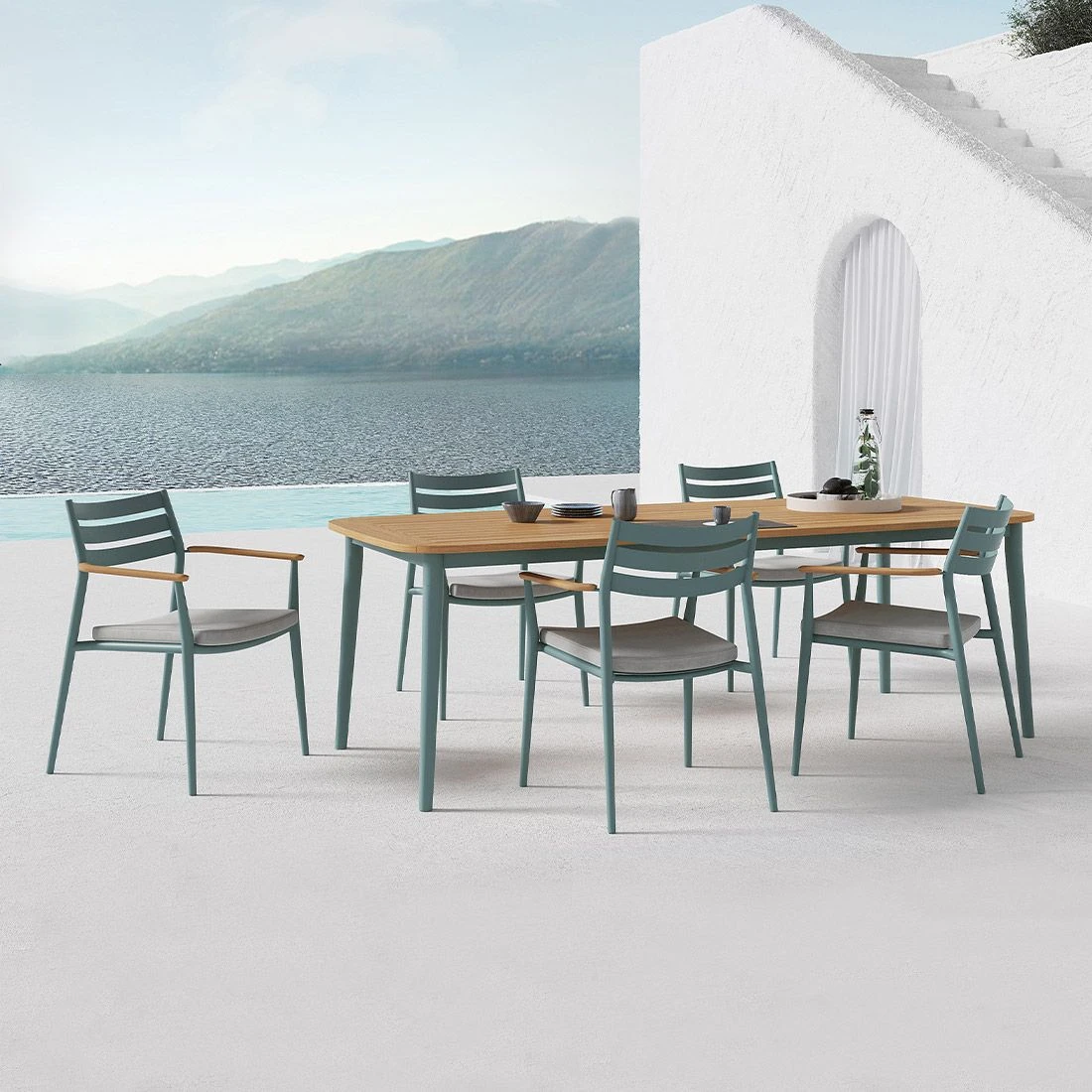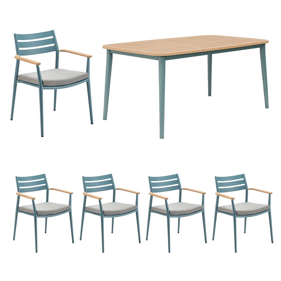Das Gestell ist aus Aluminium gefertigt. Dadurch lassen sich die Möbel leicht von einem Standort zum nächsten transportieren und sind dennoch sehr stabil. Als hochwertiges Material für die Bezüge kommt ein Acryl-Stoff zum Einsatz. Er ist sehr strapazierfähig und bietet somit die idealen Voraussetzungen für den Einsatz im Freien. Farblich begeistern die Bezüge in elegantem Anthrazit. Im Set enthalten ist auch ein passender Tisch. Die Platte des Tisches ist aus edlem Teakholz gefertigt. Durch den sehr hohen natürlichen Ölanteil, ist sie damit gut vor Witterungseinflüssen geschützt. Die Form des Tisches ist klassisch rechteckig gestaltet. Als klassische Design-Komponente fungiert das geradlinige Vierfußgestell. Farblich ist das Gestell in Petrol gehalten, die Tischplatte überzeugt in der Farbe Natur.