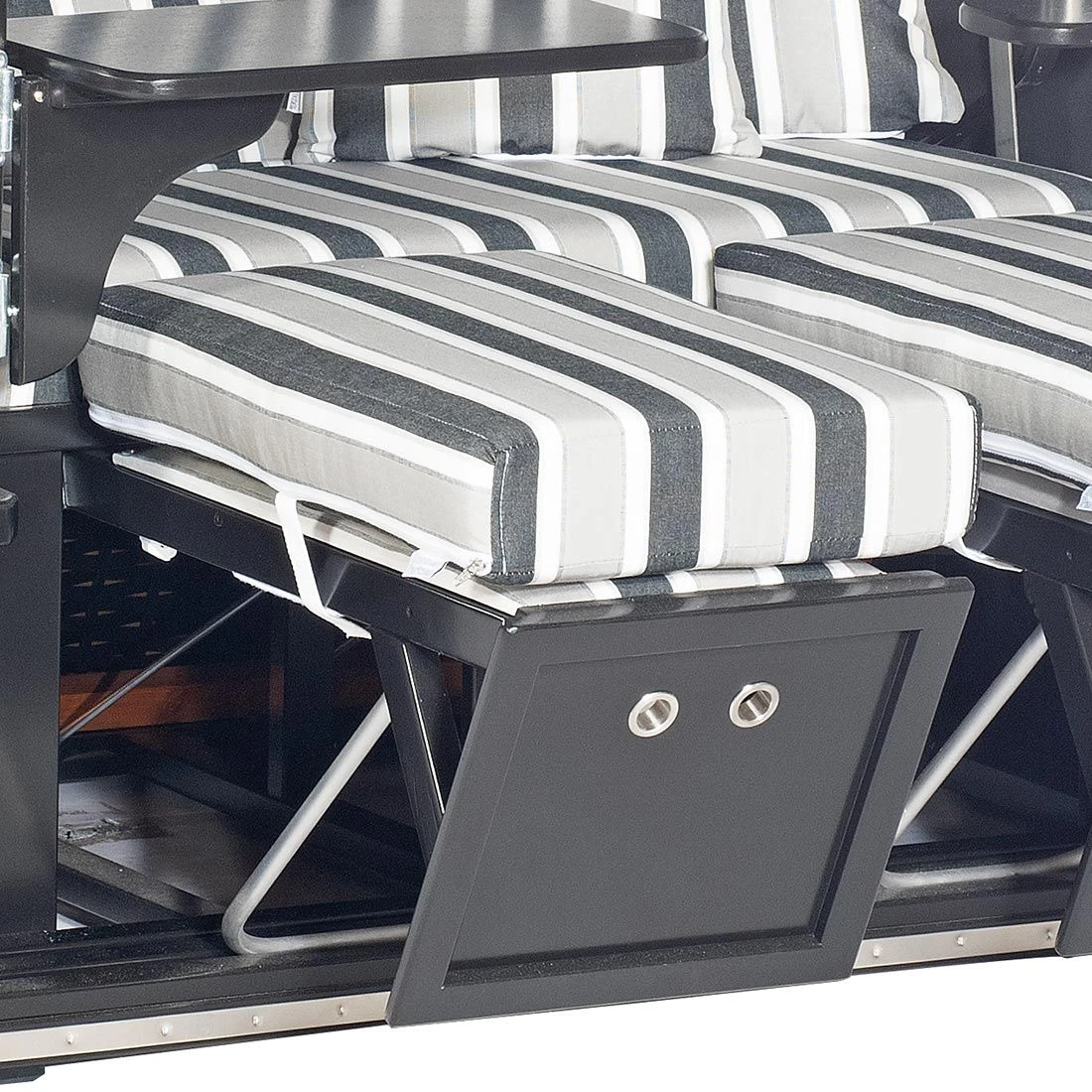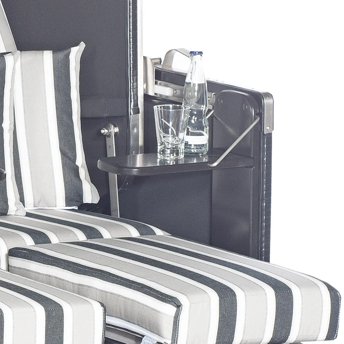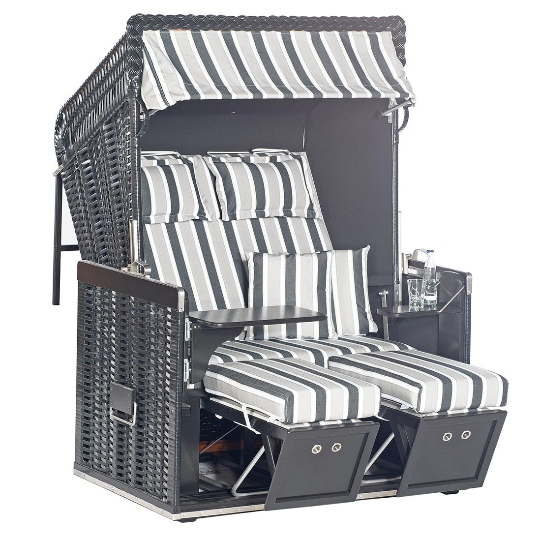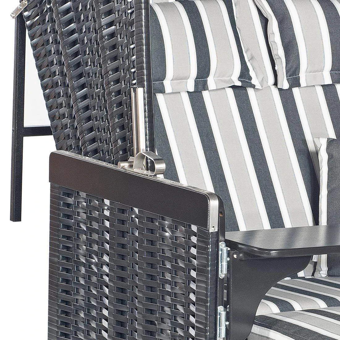 Die Bezüge des Strandkorbs bestehen aus Strukturpolyester-Gewebe. Das Material begeistert mit der angenehmen Oberflächenstruktur und einer herausragenden Witterungsbeständigkeit. Der Strandkorb selbst besteht aus Fichtenholz sowie Kunststoffgeflecht. Beides harmoniert hervorragend miteinander. Das Grundgerüst des Strandkorbs ist in Schwarz Matt gehalten. Darüber hinaus begeistert der Strandkorb Konsul mit seinem Kunststoffgeflecht im Farbton Schwarz Matt.