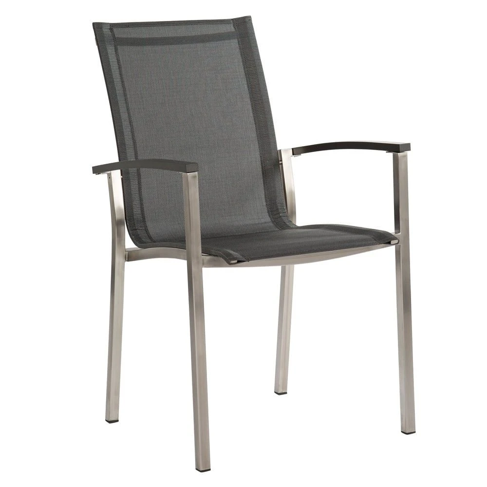Die robusten Edelstahlgestelle sorgen für eine hohe Stabilität und Tragfähigkeit. Darüber hinaus begeistern diese mit einem zeitlos eleganten Look. Ein weiteres Highlight der Sitzmöbel ist die Bespannung der Sitzflächen mit Textilene in der Farbe Silbergrau. Dieses Material zeichnet sich durch eine hohe Robustheit gegenüber Hitze und Frost aus und ist leicht zu reinigen.