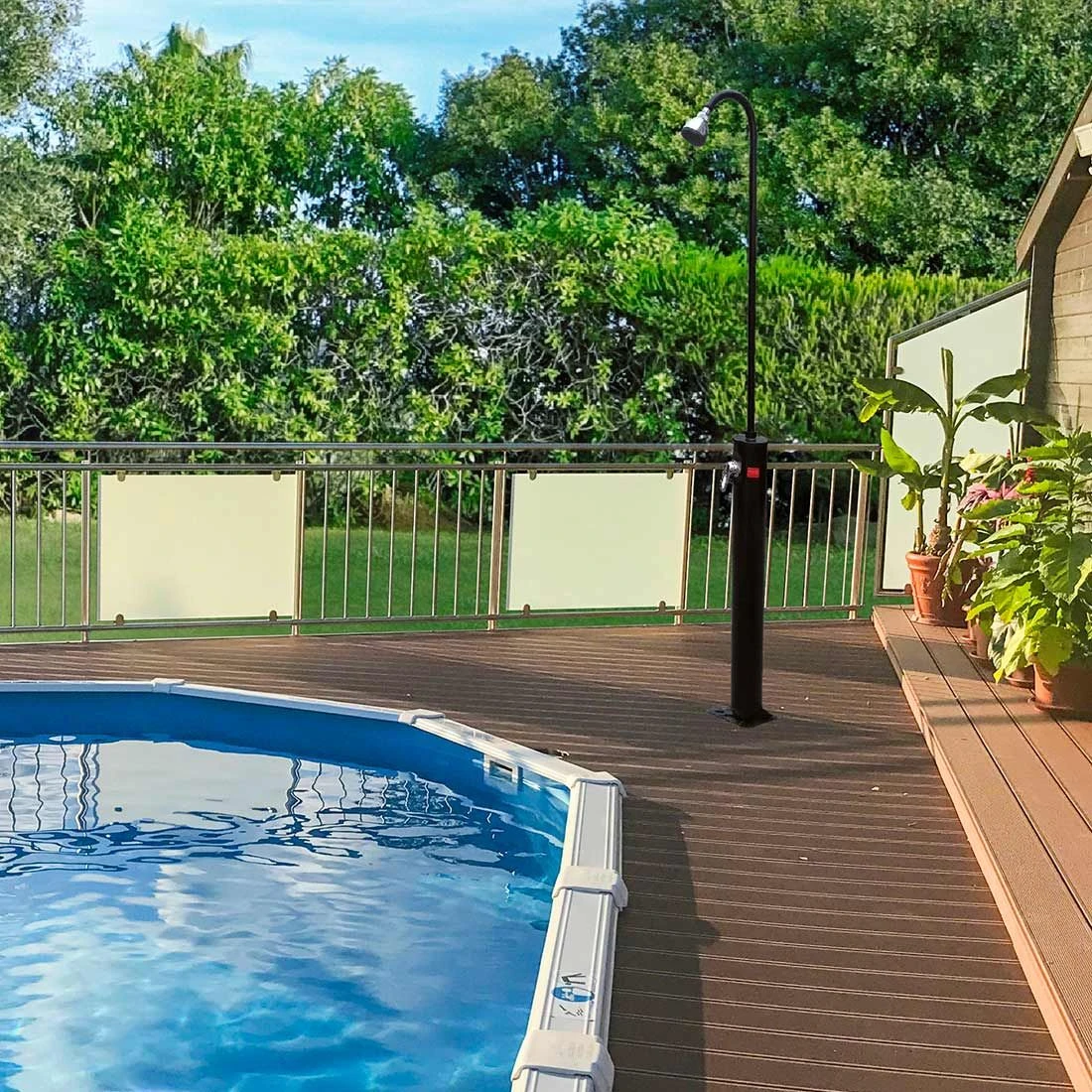 Vor dem Sprung ins erfrischende Nass sollten Sie sich auf jeden Fall abduschen, um den Schmutzeintrag in das Poolwasser so gering wie möglich zu halten. Unser Tipp: Installieren Sie einfach die schicke Summer Fun Basic Solardusche in der Nähe des Schwimmbeckens. So können Sie warmes Wasser ganz ohne Stromverbrauch genießen. Denn das Wasser wird hier einfach durch die Kraft der Sonne erwärmt.