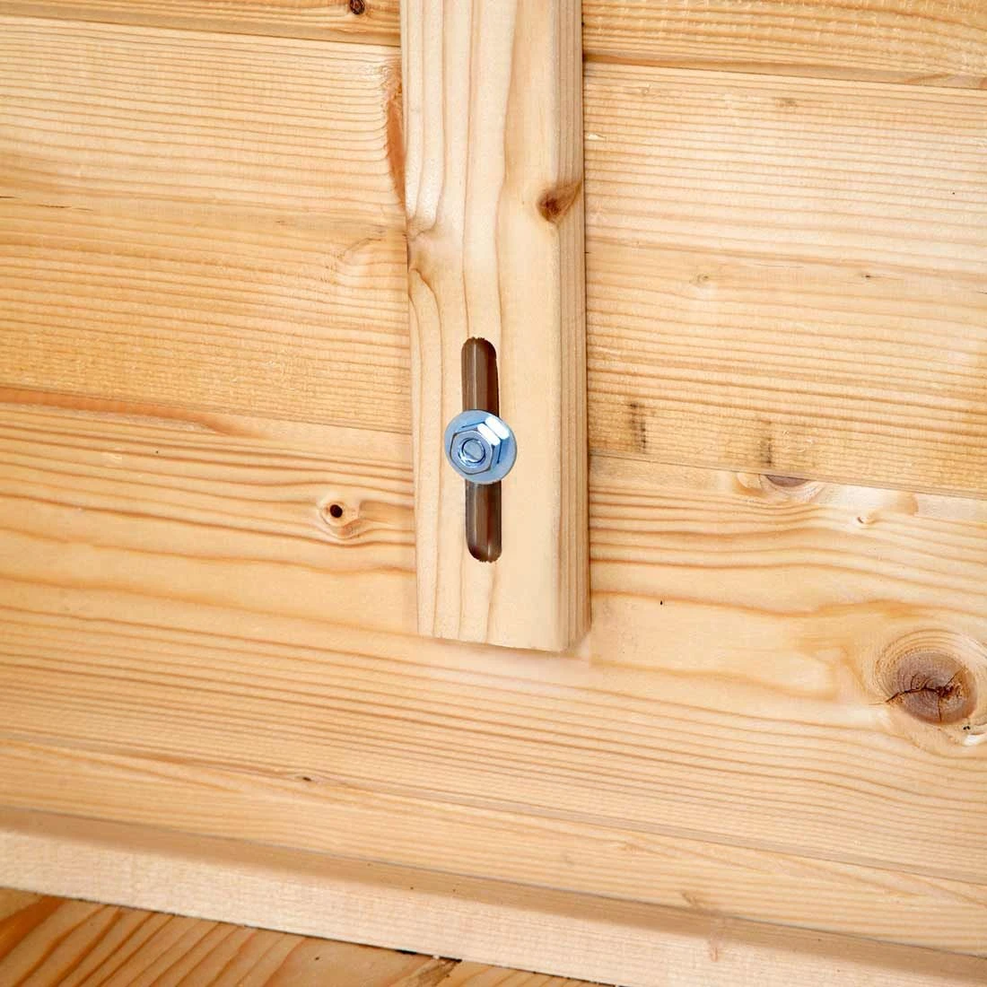 Weiterhin zeigt sich die hochwertige und optisch ansprechende Verarbeitung des Gartenhauses in der verglasten Leimholz-Doppeltür mit Zylinderschloss. Dadurch werden Kratzer im Glas vermieden und die Türen behalten ihre Form ohne sich zu verziehen.