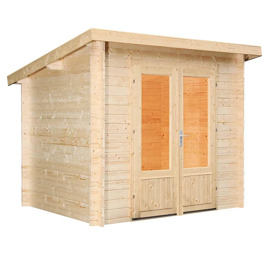 Weiterhin zeigt sich die hochwertige und optisch ansprechende Verarbeitung des Gartenhauses in der Leimholz-Doppeltür mit Fenster, die mit einer Drückergarnitur, einem Einsteckschloss und Profilzylinder ausgestattet ist. Darüber hinaus sind im Lieferumfang eine Metall-Türschwelle sowie Sturmanker enthalten.