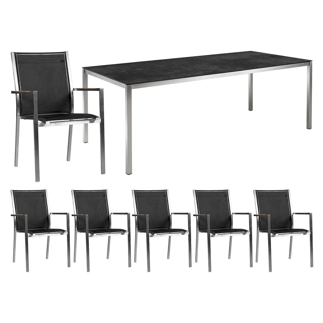 Die robusten Edelstahlgestelle sorgen für eine hohe Stabilität und Tragfähigkeit. Darüber hinaus begeistern diese mit einem zeitlos eleganten Look. Ein der Sitzmöbel ist die Bespannung der Sitzflächen mit Textilene. Dieses Material zeichnet sich durch eine hohe Robustheit gegenüber Hitze und Frost aus und ist leicht zu reinigen.